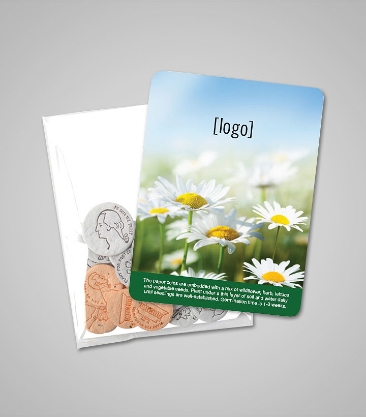 Grow money, literally! These Every-Day themed seed paper coin gift packs are handmade, letterpress printed coins on our thickest, most luxurious seed paper. Each coin pack includes a 3" x 4" printed backer card with stock design as shown on one side. Art shown is stock and included with this item. Just send us your logo or message and we'll set up a proof for you to review! Personalize the second side with your artwork in full color or leave blank.