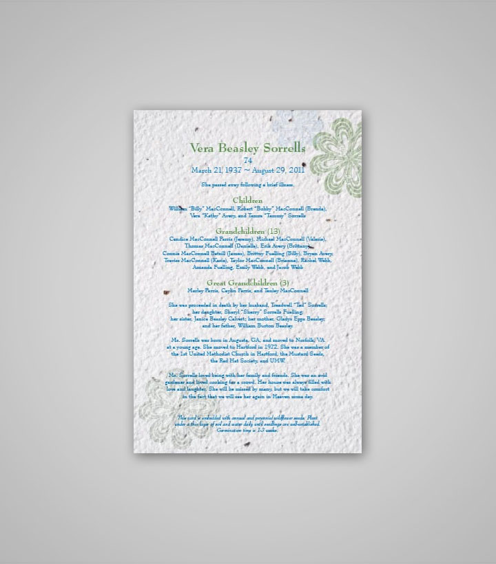Plant this memorial card and beautiful wildflowers will grow as a tribute to your loved one. Each 4" x 6" seed paper memorial postcard is 100% post-consumer recycled, white handmade seed paper, embedded with our special wildflower seed mix. Or, choose one of our 5 colorful Premium paper options (10% up-charge applies). We custom print your artwork in full color on one or both sides, using eco-friendly water-soluble inks to ensure maximum seed germination. All paper and printing is 100% USA made.
