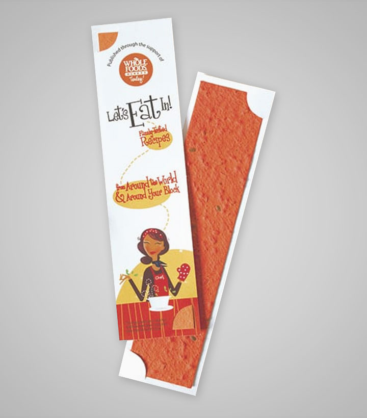 Each 2" x 7-3/4" bookmark is custom printed on our standard 60% post-consumer recycled, white card stock with your artwork in full color on one or both sides. The bookmark is adorned with a 1-3/4" x 7-1/2" seed paper strip in your choice of seed paper color.